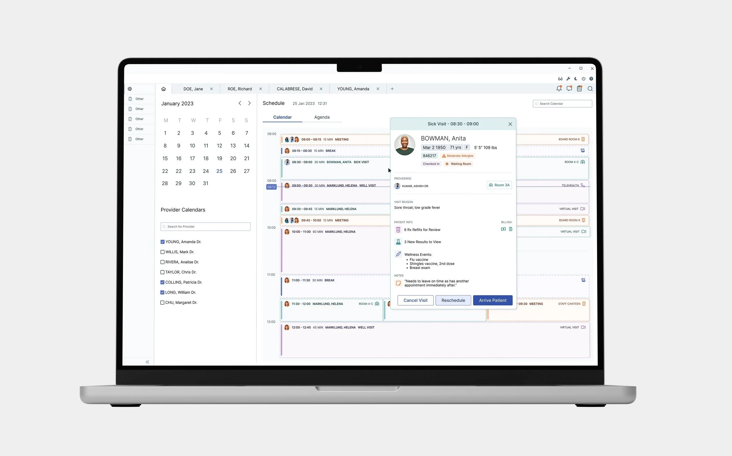 Quick Patient Access – Click on a schedule item to instantly view patient details, including immunizations, medication refills, lab results, and notes from the previous provider.